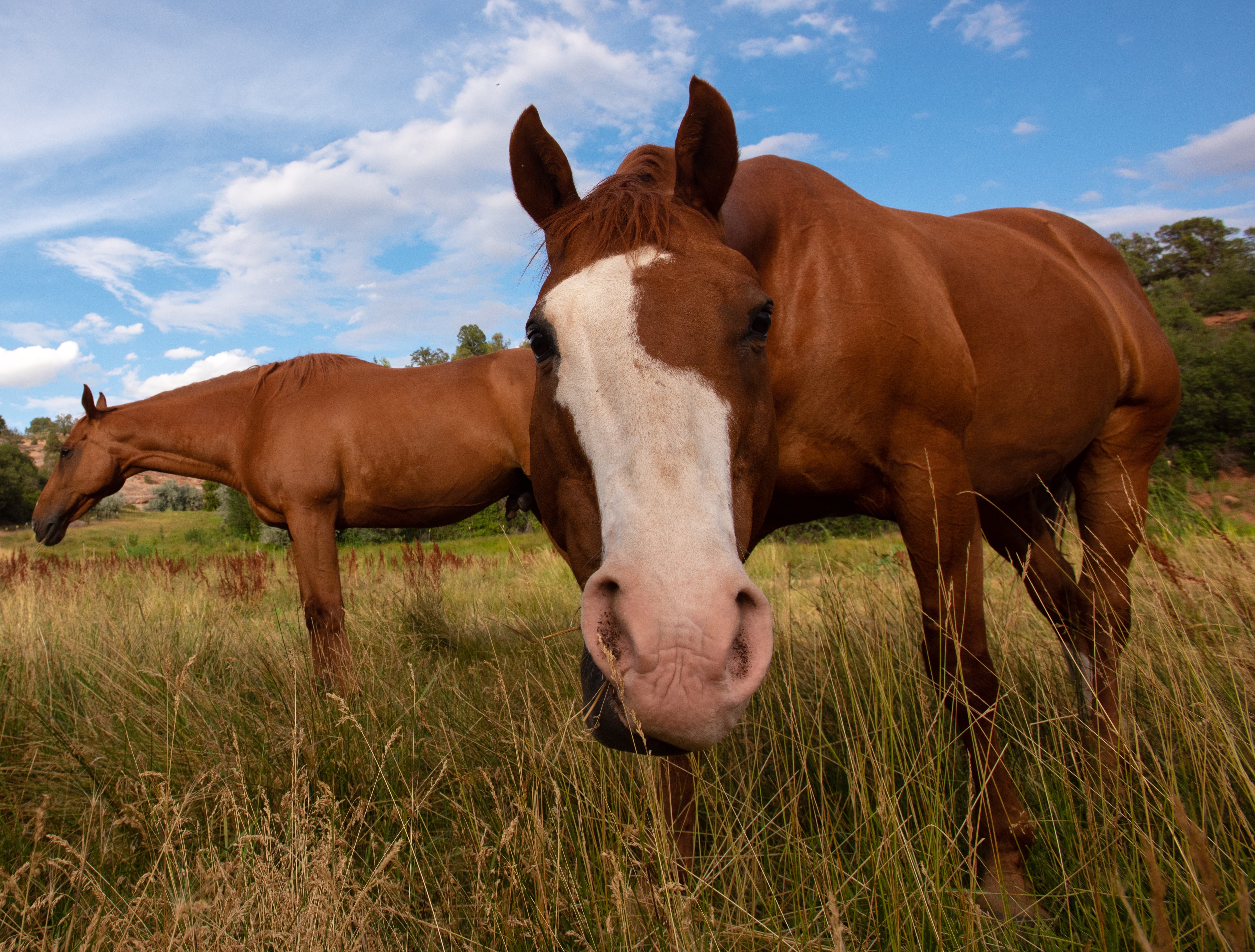 Two horses in a pasture with red rocks in the background
